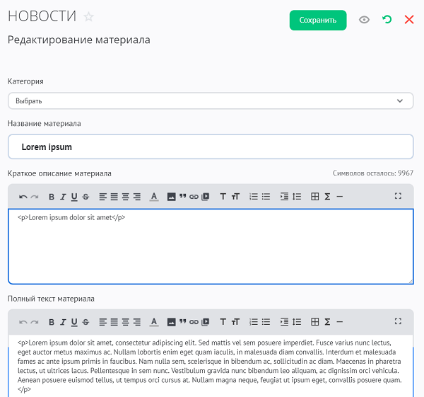 Быстрое редактирование материалов не покидая панели управления упрощает работу с контентом сайта.