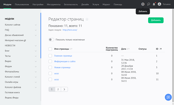 Создание новых и управление уже существующими страницами сайта – всегда на виду.