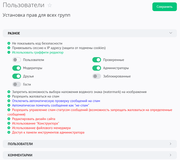Разделение прав доступа к сайту для различных групп пользователей не покидая страниц настроек