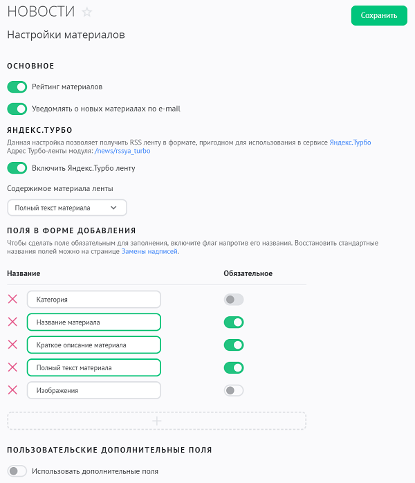 Управление полями для добавления материалов в удобном визуальном конструкторе. Менять названия